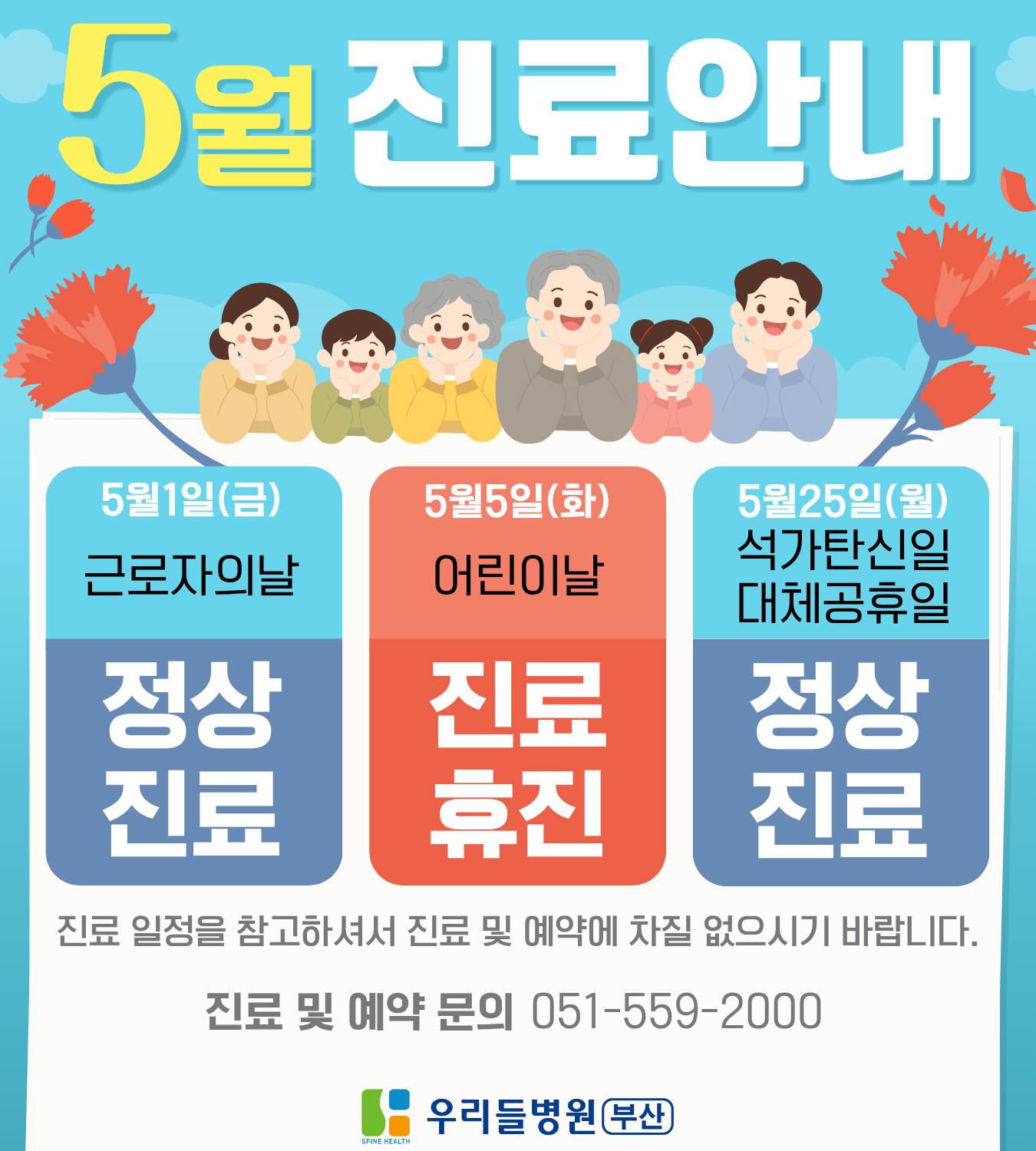 안녕하세요 보건복지부 지정 척추전문병원 우리들병원입니다. 풍요로운 한가위 건강하게 보내시길 바라며, 10월 추석 연휴 진료일정 안내드립니다. 10월 3일(금) : 오후 3시 30분 까지 진료 10월 4일(토) : 오후 1시 까지 진료 10월 5일(일)~9일(목) : 진료휴진 10월 10일(금) : 정상진료 합니다. 진료일정 참고하셔서 내원 및 예약에 착오 없으시길 바랍니다.